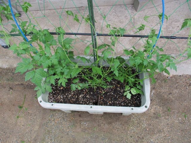 3週間前にプランターに植え付けておいたオキナワスズメウリとフウセンカズラです。今日になって、ようやくネットを設置しました。こちらはフウセンカズラ。3本植え付けています。そしてオキナワスズメウリ。手前にフウセンカズラを1本、奥にオキナワスズメウリを2本植え付けています。カーテンには程遠い状態ですが、今年は本数を増やして厚みのあるカーテンを目指しています。