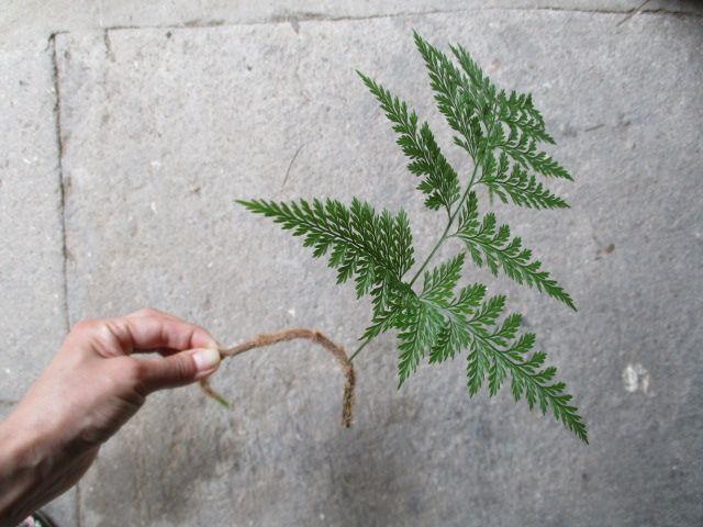 シノブを育て始めてから、ずいぶん経過しました。茎がたくさん伸びてきたので、一部を切って挿し芽をすることにしました。茎は約15cm、葉っぱは1枚。湿らせた水苔で包み、木綿糸でぐるぐる巻きにしました。プリンが入っていたガラス容器に入れるといい感じです。これだけでも充分に楽しめます。
