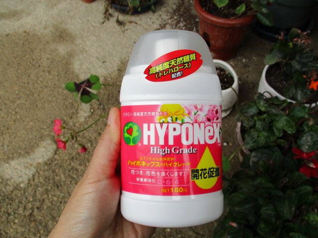 鉢花にはこちら液肥がおすすめです。リン6・カリ4、窒素はゼロです。規定量に希釈して、2週間おきに施しています。花の色も濃くなり、よく咲きますよ。↓キャップには軽量できる目盛りが付いています。ハイポネックス ハイグレード開花促進 180ml価格:480円(税込、送料別) (2018/6/20時点)