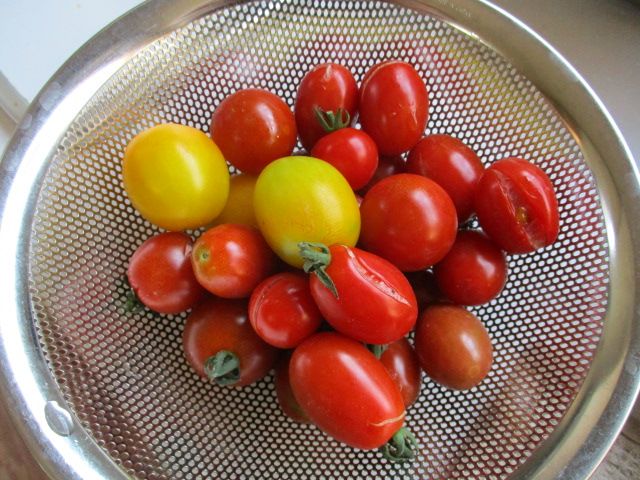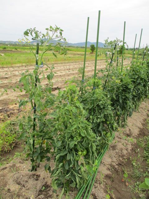 植え付けから約1ヶ月半が経ったトマトです。今日、ようやく収穫できました。一昨日から昨日にかけての雨の影響で、割れてしまったものも多いです。でも、さすがは露地物。甘くて美味しいですよ。