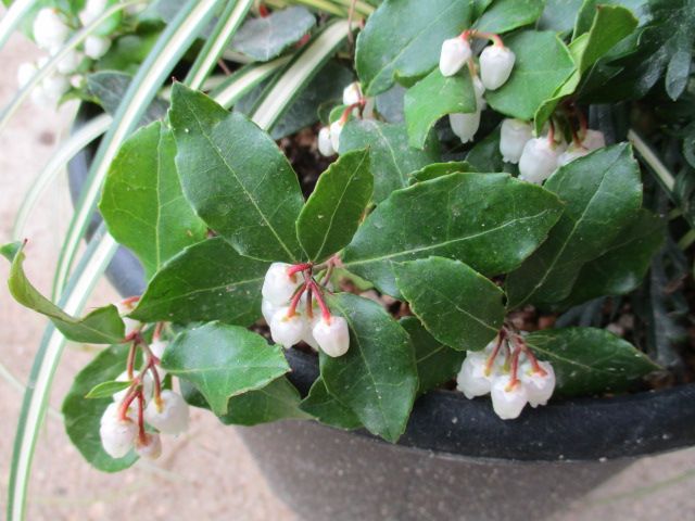 ブルーベリーのように見えますが、これはチェッカーベリーの花です。先日、母が以前作った寄せ植えを植え替えたものです。近づくとこんな感じです。ブルーベリーの花によく似ていますね。母が持ち帰った時には、すでに真っ赤な実が着いていました。この花がどんなふうに変化していくのか、まだ見たことがないので今後が楽しみです。