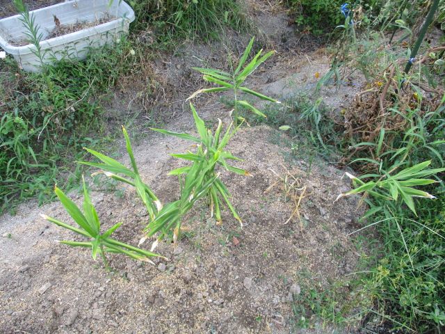 ショウガはずいぶん枯れてしまいましたが、5個くらいは残っているようです。2年前にもショウガがかなり枯れましたが、その時よりはましです。久々に草引きをしたらすっきりしました。これ以上は枯れないことを願って、中耕後に約1ヶ月半ぶりの追肥を施しておきました。よく見ると、新しい小さな芽が出ています。あまり大きくならないでしょうが、見守りたいと思います。