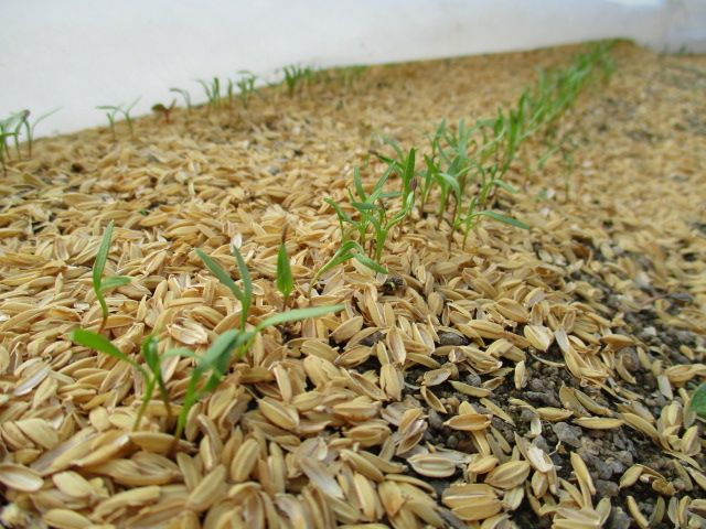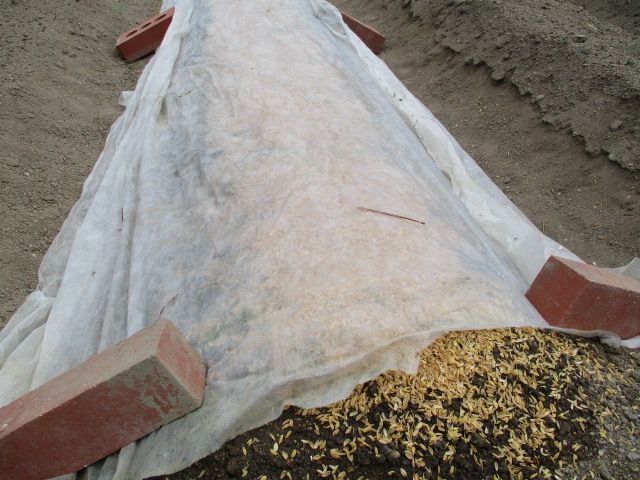 降る降ると言われながらも、大して雨が降りません。雨が降ったらと思っていましたが、もう諦めました。金時人参の種まきです。ずいぶん出遅れてしまったと思いましたが、去年と比べると1週間しか遅れていませんでした。しっかり水やりをしてから種子をまき、薄く土をかけた上に籾殻でマルチング。乾燥予防のため、さらに不織布で覆っておきました。