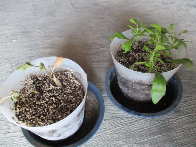 約2ヶ月前に挿し芽をしたオステオスペルマムです。徐々に枯れて減っていき、ラベンダーフロストの方はなくなってしまいました。ピンクの花の方は、鉢底から根っこが少し出てきています。それにしても、今年はいつもの方法がうなくいかないことが多いですね。