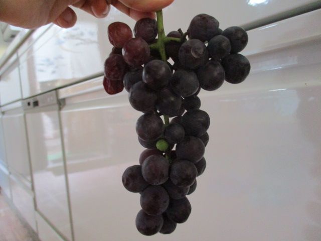 袋をかけたのが約2ヶ月前です。その時には5房ありましたが、収穫できたのは4房です。大きさはまずまずです。ただ、この暑さです。収穫時期が少し遅かったようで、上の方はこんなに干からびてしまっています。実も小ぶりで、硬めです。それでも味は濃厚で、「なかなかいけるよ」と姪っ子。来年はもっと上手に育てたいと思います。