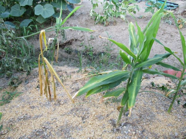 あまりの暑さにショウガも次々と枯れています。水やりが追い付きません。二年前は水やりができない畑で育てていたので枯れてしまいましたが、ここは水やりしています。それなのに枯れます。不織布ででも覆うといいんでしょうが…。そうすると水やりしにくいんですよねぇ。