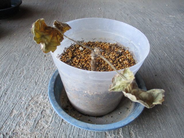 嫌な予感はしていました。3種類の挿し芽のうちの2種類が枯れた時点で、もしかしたらとは思っていました。こんなにチリチリです。ゼラニウムは暑さに弱いらしいので、毎日水やりをしてもこの調子です。これだけ過酷な暑さでは仕方がないですね。