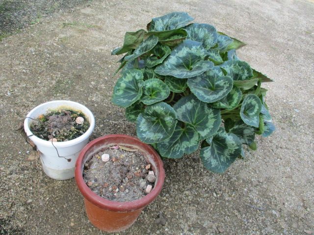 去年の冬に入手したシクラメンです。母が購入したものが2株、母の友人がくれたものが1株あります。なぜか1株は葉っぱがよく茂って元気です。完全に休眠している球根です。右側は上部の皮が剥けてしまいましたが、球根が硬いので大丈夫だと思います。そう言えば、以前もそんなことがありました。葉っぱは一部を残して、ほとんど切り落としました。本来は休眠している時は水やりはしませんが、植え替えた直後なので水やりをしておきました。来シーズンも咲いてくれるといいですね。↓こちらの土を使っています。花ごころ ガーデンシクラメンの土(5L)価格:525円(税込、送料別) (2019/7/5時点)楽天で購入