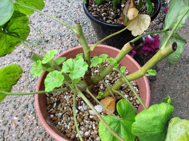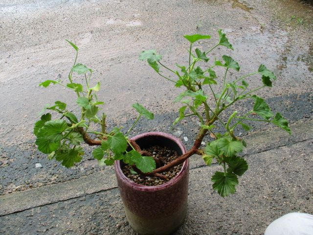 一時期、枯れそうになっていたバラ咲きのゼラニウムです。その後復活し、今年もたくさんの花を咲かせ、枝もぐんぐん伸びて元気一杯です。でも、あまり大きくなってしまうと植え替える時が大変なんです。伸び過ぎて垂れ下がっていた枝を剪除して、込み合った枝も間引いておきました。ここからどのように盛り返してくるか、それはそれで楽しみです。