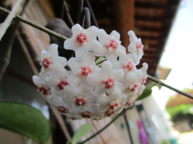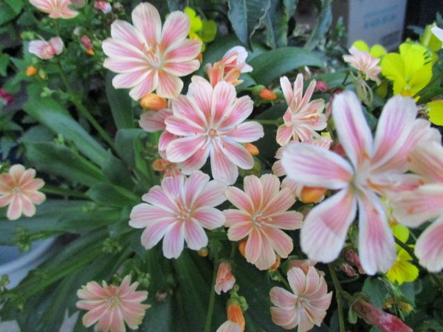 この花は、昨年末に母が作った寄せ植えの中の一つです。もう半年以上経ちますが、3回目のシーズンを迎えています。1本の花茎にいくつもの花が咲くので、とても賑やかです。花茎は葉っぱと葉っぱの間からたくさん伸びています。これから開花するものもありますよ。これ、なんていう花なんでしょうかね。