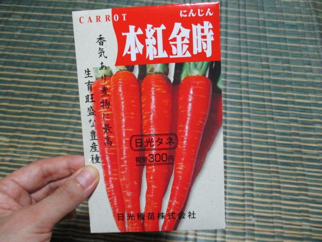 年末に収穫する金時人参の種子を準備しました。夏真っ盛りですが、年末の心配をしなければいけません。野菜作りは、結構頭を使いますね。種まきは8月半ばの予定です。↓去年と同じ種子を準備しています。にんじん 種 【本紅金時人参】 8ml ( 種 野菜 野菜種子 野菜種 )価格:303円(税込、送料別) (2019/7/29時点)楽天で購入