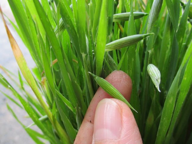 「犬と猫が好きな草」の種子をまいてから1カ月半が過ぎました。ワンコ自ら進んで食べないので、相変わらずフードにトッピングして食べさせています。何度かちぎっているうちに、実ができていました。それを見た母が、これはからす麦に似ていると言っていました。麦ね〜。