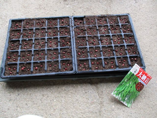 ほぼ毎年、小豆を育てています。年末の餅のあんこにするためです。25穴の育苗トレイ2枚、つまり50穴に種子を3粒ずつまきました。このあとは覆土をして、雨がかかる庭先に置いておきます。