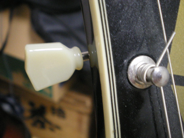 倒した拍子にペグが壊れたので何かと評判の悪いこのタイプに変更。チューニングは思ったより不安定じゃない。それよりコンバーションブッシュなしでつけちゃったためにガタガタする。あんまりガタガタするから接着剤で頑張ってとめてる。