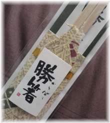 仙台駅の物産展でお買い物をしたら頂きました。『勝箸』宮城県漁協雄勝湾支所のお母さん達の手作りの箸入れ仮設住宅で一つひとつ心を込めて折りましたと書かれてあります。津波に負けなかった神社のお祓いも受けているそうです思いがけず、素敵なお守りを頂いて幸せな気持ちになりました買ったものは、切り落としゆべし315円。。。(ゆべし大好き)なんか、すいません...一番安い商品で^^;