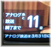 家に1台残っているアナログテレビずっとこの「あと〇〇日」が出たまんま・・・震災の影響で延期されていた東北3県のアナログ放送も、もうすぐ終了。。。こちらでは、まだ『地デジカ』活躍してますよ~