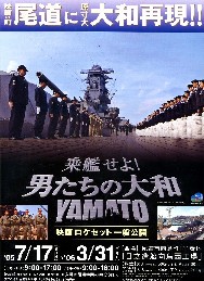 行ってきた。尾道のロケセット(^_-)-☆順路に従って進んでいくと、船首の近くで、まず記念撮影があり、自分たちのカメラでも撮影してくれる。(結局私たちは買わなかったけど、上手に買わせるようにできている)次は、チケットを購入。階段を上がって大和に乗艦。ここから本格的に大和セット見学が始まる。本当に広い。こんな巨大なものが海に浮かんでいたことが想像できない。降りると、次は大和の資料展示館(2階に上がる)。「阿賀海岸通り」というバス停に、阿賀っ子のダンナは感動していた。メイキングビデオは迫力ある映像で見ごたえあり。降りると、最後は『圭ちゃん食堂』というスタッフの方々が撮影時に利用したという食堂に、誘導される(ようにできている)。大和ラムネソフトクリームという、水色のソフトクリームにチャレンジしたが、私は普通のバニラのほうが好きだ(>_