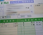 充実した土曜日を朝から満喫し、ウキウキしながら戻った私を待っていたのは2枚の紙。 ↓【アレルギー検査報告書】↓ 注:もう1枚は【検査報告書】で、もっと詳細な数値が記載してある。そういえば、午前中に兄ちゃんの花粉症の検査結果が出ているんだった。妹はすでに「かふん小」へ入学してしまったのだが、実は、兄のほうがもっと前からそんな症状がみられていたのだ。・目をかきむしる・のどを「かーっ、かーっ」って言わせる・水のような鼻水が出るでも、認めるのがイヤだったので毎年なんとかごまかしごまかし、この時期を乗り切ってきた。ある程度の予想はついていたけど、実際に数値として見せられると、やはり心理的ショックは大きい。いつものように、鼻から牛乳~の曲が頭の中をかけめぐる。基準範囲が0.34以下に対し、スギは25.4、ヒノキは1.92。これはそれぞれ妹の3倍、2倍の数値だ。しかし、当の本人も、医者に同行した父親(ダンナ)も妹も、誰一人としてそのような様子はかけらも感じられない。・・・楽天的な家族で良かった
