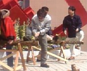 土曜日はきのぴーさんにたいへんお世話になったので、恩返しのつもりで、きのうはアリスガーデンに行ってきた。子どもたちは、デオデオ・ネバーランドに行きたがっていたので、親子で利害関係が合ったというわけだ到着したのは13時20分くらいだったか?実は、お昼ご飯を福屋で食べるつもりだったのが、気に入ったメニューがなかったらしく、子どもたちからブーイングが出て却下。(単に福屋の商品券が使いたかっただけ)お腹をすかせて会場入りしたのだった。着いてすぐにきのぴーさんを発見!なぜか子ども二人は、いつの間にか遠ざかっている食べ物コーナーを教えてもらって、きのぴーさんはまた忙しくカメラマンに戻っていった。子どもたちを呼び戻すと、兄ちゃんが開口一番。「お母さん、あの人、オーストラリアの人?」どこからそういう発想が出てくるのか、おまえの頭をわって見たい。(washi-pさん、パクってごめんなさい)ピンチョスは食べなかったけど、美味しいサンドイッチを食べて、何やら賑やかになっているステージを見ると、丸太切りのイベントが始まる様子だ。女性もOK!と言われ、何人か女の人も挙手している。腰の爆弾がなければなぁと考えるも、ここでギックリを起こしたら、末代までの恥だとぐっとこらえる。近くで見たいと子どもが言うので、ステージの下に並べてあるイスに座って見物することにした。パッキーンという音と共に、何度も折れるのこぎりの歯。きのぴーさんも中継してくれていたけど、のこぎりが折れる瞬間を見るのも珍しい。いちばん速い方は、20秒という記録。(実はこの方、本職さんでした)単純に一本の丸太を切るのに、こんなに盛り上がるものなんだ。見ているほうも楽しかった。 ←きのぴーさん、スタッフなのに~(^^)あとはネバーランドで延々歩き回り、広島そごうからクレアラインを使って帰途につく。夕食は新広駅近くの「なか卯」で丼もの。はぁ~、久しぶりに歩いたなぁ。土曜日は座り続け、日曜日は歩き続け、そしてきょうはまた座り続けの日になりそうだ。そろそろ仕事をまじめにしないと…軽くヤバい(^_^;)