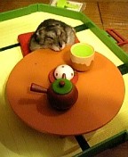 我が家のアイドル、ジャンガリアンハムスターの“ひまま”一昨年の9月、娘のお誕生日プレゼントとして我が家にやってきた。もともとそういう性格だったのか、はたまた粗暴な娘にしつけられたせいか、非常に従順でおとなしい。 小さいころからわしづかみされてきたので、背中からぐわっしっとつかんでも抵抗もしない。おまけに、眠いときにはお腹を上にして平気でひっくり返ったまま眠る。この飼い主である娘は、この子をわしづかみに持ったまま、こたつで眠ってしまうことがある。当然つかまれた指から解放されたひままは、部屋をお散歩するわけだ。それを知らない私たちは、がそごそという音で気がつく。「ぎゃぁ~、ひままがまた脱走じゃぁ~」きのうも、部屋の隅で何やら動く影を見つけたダンナが叫んだ。いつか、知らずに踏んでしまうんじゃないか…、想像すると怖い。