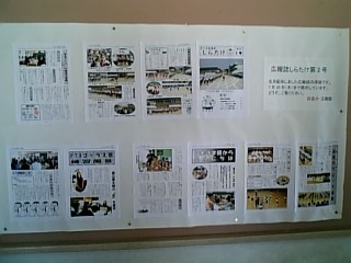 広報誌2号は、おかげさまでみなさんに好評で、不鮮明な写真でも楽しい雰囲気が伝わると評判でした。しかーし、このカラー写真を見てもらったら、もっと掲載された方たちの活躍ぶりを、よりダイレクトに感じてもらえるかなと、教頭先生にお願いして、貼ってもらいました。 終業式までが掲載期間です。あゆみ渡しのときに、ぜひご覧ください。って、ここで言って見られる人はいったい何人? ↑広島ブログに参加しています。↑ よろしければカチッとクリックお願いしますm(__)m