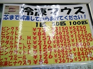 きのうは久しぶりに、東広島のFGに買い物へ。仕事優先とはいえ、時には家族優先にしなきゃならない場合もあります。(その分、きょうからがんばるぞー)そこに行けば必ず立ち寄るのがペットショップ。行ったことがある人はご存知でしょう。以前は、100万円の白ふくろうが角にいましたね。売約済みの札が掲げてあったのが昨年のことで、さすがにもうあの子の姿はありませんでしたふくろう、好きなんです、なんとなくでも、きのうは考えさせられる紙が壁に貼ってありました。 左上には、実際のソレの写真があり(2匹上下に)、上の子は「さむいね」、下の子は「さむいよぉ」という文字がコメントのように書いてありました「エサ用」なんですね、この子たちは。同じように生まれてきて、人間にかわいがってもらえるペットもいるというのに。ちょうど、小さなハムスターたちを見たあとだったので、気分がどよーんと落ち込みましたこのチラシの横には、商品名:ふくろうMIXコメント:切り刻んであります。っていう別のチラシも貼ってありました。どうやら、マウス・ラット・ヒナウズラの混合製品らしいです。 ・ ・ ・ ・ ・ふくろうは飼えないと残念な気持ちでお店を後にしました。↑飼う気だったんか? ↑広島ブログに参加しています。↑ よろしければカチッとクリックお願いしますm(__)m