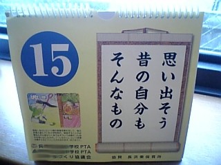 いつだったか中国新聞にも掲載されていたので、ご存知の方もいらっしゃるかもしれませんが、今年度、子どもの通う中学校主催で、日めくりカレンダーというものを作成しました。掲載する文字と絵は、小中の保護者から募集し、思ったほどは応募が多くなかったおかげで、見事、我が家の参加作品も掲載してもらえました 全部で31作品が、毎日毎日このような標語と絵で綴られております。絵はお子さんが描かれたり、保護者の方が描かれたり。もちろん、ウチは絵描き娘の作品ですその絵の下に、標語に込めた願いというコメントがあります。 ガミガミと玄関先で角を出して怒る母を残し、幸せそうな笑顔を浮かべて、虫捕りに出かける娘の図。これ、実は、「怒ってるお母さんの言うことを聞き流して、遊びに出かける自分を描いて」ってリクエストしたんです。絵が上手ってすごいことですね。頭の中の構図をこうして表現できるのですから。いまだに絵を描くことが苦手な私にはうらやましい限りです。カレンダーの話に戻りますが、みなさん、ステキな標語を考えていらっしゃいます。私は敢えてその中で、ゆるゆる系を狙ったのが良かったのでしょうか?耳が痛い標語のひとつ。“後でね”は 子どもに話す気 なくさせる来年は少しでもこの言葉が出ないように気をつけます ↑広島ブログに参加しています。↑ よろしければカチッとクリックお願いしますm(__)m