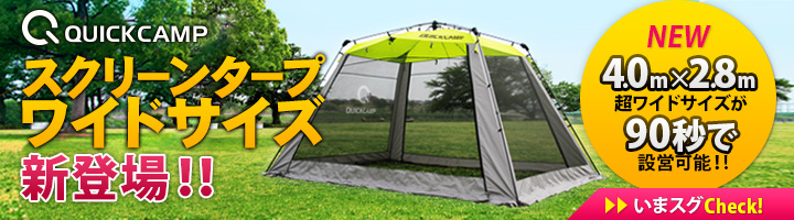 先日ブログでご紹介しておりました4Mサイズのワイドスクリーンタープ入荷いたしました!一緒に新色イエローの3人用テントがたっぷりとグリーンも70張だけ入荷しています。グリーンは2日くらいで完売します。。。。(T T)是非新色のイエローをご検討くださいませっ><ちなみに、フルフラップとのセットがお勧めです。アウトドアデイで接客させていただいたお客様も10名くらい「入荷したら買う!」とおっしゃってくださいました。キャノピーポールがあればフラップはキャノピーとしても使えます。 セットのフラップは2枚付き(フロントとサイド)ですが、フラップ追加購入いただければフルクローズにもできます。普通にフラップとして使うとこんな感じ上の画像はサンプルで撮影しているので、実物にはQUICKCAMPのロゴ入ります。3Mサイズ(フルクローズ)もキャノピー仕様可能です。個人的にはフルクローズしなくて良いので4Mサイズが好みです。ちなみに、風に弱い?というお声を良く聞きますが、コールマンのインスタントシェード等を含めこのタイプは風のある場所ではペグとロープ固定を前提としています。ロープ張れば全然大丈夫です!ではでは☆【送料無料】クイックキャンプ ワンタッチ ワイドスクリーンタープ 4m×2.8m UVカット タープテント QC-SS400 【QUICKCAMP スクリーンシェード ワンタッチテント サンシェード】 【espb】 6/13動画撮影しました!