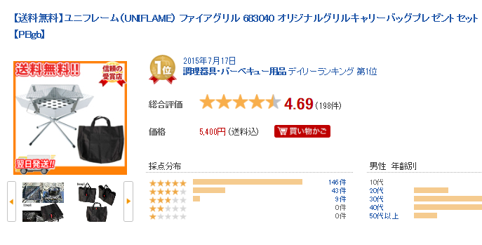 2014年楽天ショップオブザイヤー スポーツ・アウトドア部門で大賞を受賞させていただいたeSPORTS楽天支店のアウトドア用品ランキング(6月17日~7月16日集計)です。◆今月のPICKUP◆第7位【送料無料】ユニフレーム(UNIFLAME) ファイアグリル 683040 オリジナルグリルキャリーバッグプレゼントセットユニフレームのファイアグリルは焚火台としても簡単なBBQ台としても人気の定番商品ですが、そこにeSPORTSのこだわり専用バッグをお値段据え置き!でお付けしました。レビュー評価が驚異の4.69!(お客様の9割以上が★5か★4)今売れてます!☆ここからがランキング☆【第1位】オリジナル アルミピクニックテーブル セパレートタイプALOT-90夏の定番ピクニックテーブルセット♪毎年この季節は不動のNo.1となってます。【第2位】QUICKCAMP ワンタッチテント3人用 QC-OT210売れすぎて1か月欠品していましたがようやく再入荷!この簡単さを味わうと普通のテントが使えなくなるという噂が。【第3位】ポータブルハンモック ゆったりロングサイズ使い心地と色にとことんこだわったハンモック。欠品カラーも再入荷しました!【第4位】コールマン ナチュラルモザイクリビングテーブル140言わずとしれたコールマン商品でもこれが一番人気♪モザイク柄がサイトに映えます。【第5位】在庫処分セール 2WAYワンタッチサンシェード お着替えタイプとにかくこの値段では今後一切買えない在庫処分セール品(他にもあります)【第6位】QUICKCAMP ワンタッチ ワイドスクリーンタープ フルフラップセット QC-SS400好調で欠品しているワンタッチスクリーンタープ(3M)の新モデル。幅4Mでもワンタッチ♪【第7位】ユニフレーム(UNIFLAME) ファイアグリル 683040 オリジナルグリルキャリーバッグプレゼントセット【第8位】コールマン タープ イージーキャノピーST II /220(ピンク) 【第9位】ダンロップ(DUNLOP) キャンピングマット 50mm GMT36ES オリーブ × 2枚 お買い得セット【第10位】コールマン(Coleman) パフォーマー/C5(ネイビー) 2000016928 ×2個セットeSPORTS夏の人気商品ランキングでした!