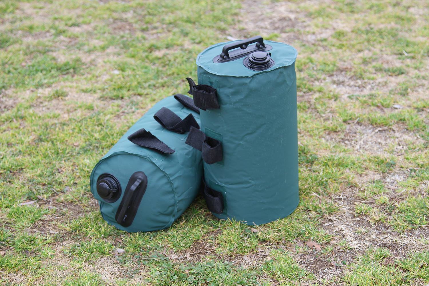 バーベキューから運動会まで、季節を問わず活躍するアウトドアタープ。使用する時は風などで飛ばされないようにペグで固定するように説明書には記載されています。でも意外とペグを打てる場所って限られてるんですよね。。。キャンプ場はもちろんOK。でもアスファルトでペグが刺さらない駐車場や公園などのイベント会場、勝手にペグ刺すと迷惑?な運動会では使えないことも。固い地面だとペグが折れてしまう事もあります。そんな時に便利なのが持ち運びできるタープ用のウエイト。色々種類はありますが、移動時に重たくない注水式がお勧めです。タープテント用 ウエイトバッグ 固定バンド付き 10L グリーン 4個セットテントウエイトとしては格安の4個で税込4980円 eSPORTSオリジナル仕様の持ち手の付いたバッグ付きです。固定バンド付きなので、タープのフレームにしっかり巻き付き、ロープが要りません。※上の画像ではガイロープを張っていますが、ロープをウエイトのハンドルに結び付けて固定することもできます。 これからのイベントシーズンにいかがでしょうか?