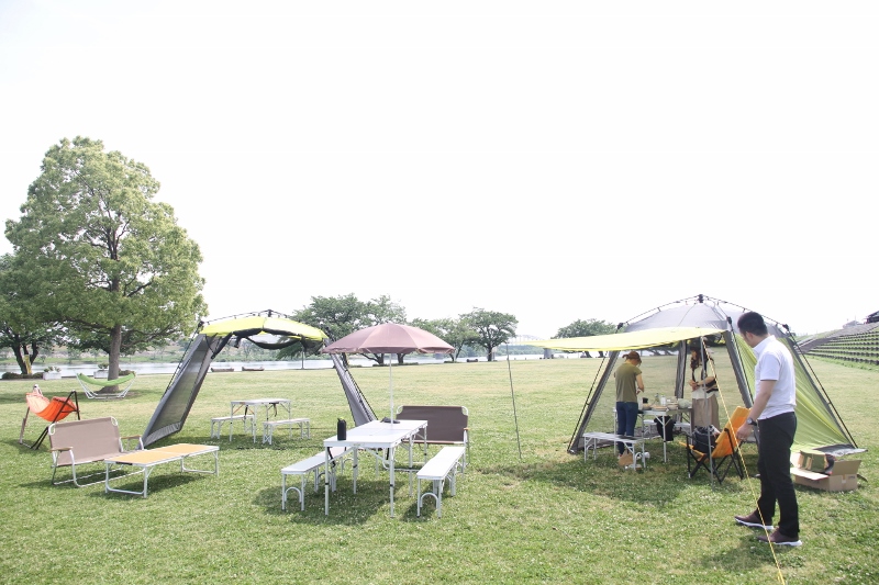 今年は天気が良くて気持ち良いですね~~♪去年は天候不順で土日雨ばっかりだったので尚更嬉しいです。新商品も色々発売されますので商品開発部のメンバーでロケに行ってきました! 右のスクリーンタープが大人気の3Mサイズ(フルクローズ)で左側のタープは27日から発売の4M×2.8Mワイドサイズです。ワイドサイズの方はフルクローズではなく、別売りのフラップをお好みで取り付けるセミクローズタイプ。※上のリンクは最初からセットになっているお買い得品番です。そしてどちらもワンタッチ!今やなんにでもワンタッチタープって付けられちゃっていますが、独りで設営できない物はワンタッチと呼ばないと思います。。。。※風が強い場所ではテント飛ばされますので2名設営推奨です(笑)4面フルメッシュだと こんな感じから→別売りのフラップを付けると こんな感じになります。壁を付ける位置は変えられるので日差しの方向に合わせて付け替えたり、フラップを2セット購入すればフルクローズにもなります。もちろんどちらもUVカット(UPF50+)さらにキャノピーポールがあればフラップはキャノピー代わりにもなる便利仕様です♪3mもタープとしては大型ですが、4Mあるとテーブル2台入りますね。4月のアウトドアデイ東京でも2.4Mのロングテーブル中に入れてイベント参加してました。あいにくの雨でしたがシームテープ加工もされているので雨漏りもせず快適でした。こちらも人気のピクニックテーブルセット(モダンブラウン)テーブルセットにブラウンとか使い始めたのうちが先駆けだったと記憶していますが、今や皆さん販売されてますね。でも、細かい仕様や品質には自信あります♪しかも自社企画なので安いです。 持ち運びできるハンモックもあります。こちらも3年目?になりますでしょうか。今年からブラウンのスタンドも追加して6色(パターン)展開になりました。色と生地の肌触りにはとことんこだわっています。ハンモックも別売りしていますので、破れたり色に飽きても気軽に交換できるのもポイント。 これからもワクワクする商品どんどん発売していきますので、よろしくお願いします!