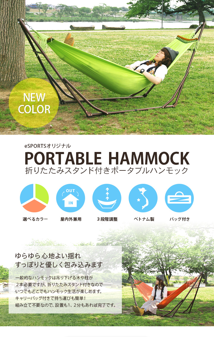 発売から3年、大人気のハンモック。今年は要望の多かったブラウンのスタンドを追加して、細かーい品質もしっかり磨いて投入しました!商品ページもリニューアルしましたので是非ご覧ください♪ eSPORTSのハンモックの他社と違うところ1.ゆったりロングサイズ開発時に他社のハンモック沢山研究しました(幅245-260cm程度)もちろん短い方がコストは安いのですが、弊社の背の高いスタッフが窮屈そうだったので15cmほど幅を長くしました。なのでほんとにゆったりです。2.生地の肌触りと色生地の種類も色々検討しました。一般的なハンモックは目の粗めの網のようなタイプ。弊社のハンモックもメッシュで通気性はありますが、きめが細かく柔らかい布に近い肌触り。それを2重に重ねていますのでスリングの様に包まる感じが病み付きになります。是非お客様のレビューご参考ください。(お叱りコメントは全て確認して改善しておりますm(_ _)m)色も、工場の既成カラーはアジアン感が強すぎたので爽やかなカラーに糸から染めて仕上げています。タダのブルーじゃありません!いい感じのマリンブルーです(笑) 子供のころハンモックって木にが無いと使えないと思ってました。。。これ持っているとバーベキューでヒーローに慣れます☆【送料無料】ポータブルハンモック ゆったりロングサイズ アップルグリーン 室内兼用 ブラウンスタンド付き 折りたたみ 自立式 HM-002 【チェア アウトドア キャンプ】【espb】