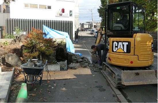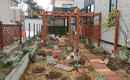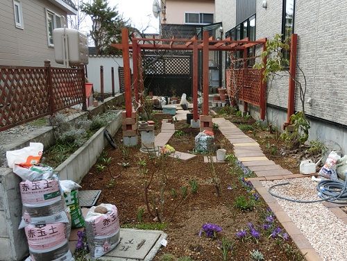 工事前に自力でしなければならない事は、●北庭にある木の中で残す木を掘り出し、移植か鉢植えにする。移植するための場所も無いので、北庭奥で土を入れ替えて作ります。ツツジ、シャクナゲ、ドウダンツツジ、カルミナ、山椒、アジサイ、●庭石は全部捨てないで持てる重さの石を再利用す為、掘り出す。泥だらけなので洗って仮置き場に積んでおき、ユニガーデンという波状のレンガと置き換えます。●交換したユニガーデンで西側に花壇を作り、土を入れ替えます。●庭石横の通路に敷いてあるガーデンジュエリーという石を取り、洗ってビニール袋に入れて保管しておく。これも再利用します。通路にある大きなレンガも洗って保管しておく。力仕事ばっかりで、体力勝負です・・・