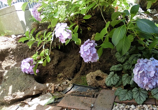 チョットお疲れ気味ですが作業は続きます。カルミナ掘りを始めました。足場に生えてた雪柳とモミジは捨てるつもりなので踏み荒らしてしまいましたが、雪柳の1部を堀り鉢植えにしました。生きてる植物を捨てるのは忍びない、だけど植える場所がない、だけど・・・・取りあえず鉢植えにして、来春考えましょこのピンクのカルミナの他に、鉢植えで赤のカルミナも持ってます。六角形の花が可愛くて好きなんです。カルミナは新しい庭に植えるので、ツツジスペースに仮植えします。アジサイは花や余計な枝を切り、スッキリさせて堀上げ、北庭のウドが生えていた場所に仮植えしました。このアジサイはピンクなので、ツツジスペースの酸性土には植えられません。さて、何所に植えるんでしょう? ・・・まぁ、来年考えようっと来年考える事が多くなりそうです