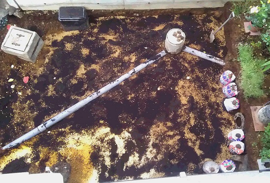 昨日のランチはピザ、夜もピザハットのピザ、今日の朝は残り物のピザ。ピザ三昧で元気10倍・・・・ってか胸やけしてます。さぁ、今日も庭仕事、頑張るぞ~。南庭の土入れを始めました。赤玉土14L入り5袋、培養土14L1袋、腐葉土40L1袋を基本として腐葉土の代わりに牛ふんたい肥40L1袋やバーク堆肥40L1袋を使います。骨粉入り油カス、米ぬか、豚ぷんなどの肥料をサッと振る様にかけ、スコップで混ぜます。掘った所との境目の土が昔のままの粘土質の土が残っていて、捨てる為袋に入れていますが、増えてきました。右手前には残っていた基礎が出て来ました。後でコンクリートハンマーで壊さなくちゃ。入れても入れても中々埋まりません。用意した土も勢いよく減ってきます。散水栓の周りは水はけが良いように、鉢底石を再利用し、軽石大粒、鹿沼土を使いました。酸性土が良いドウダンツツジ・カルミナ・花菖蒲の植え場所もまとめて、鹿沼土を使いました。気温11度、小雨もパラついて来ます。もう、止めよう。