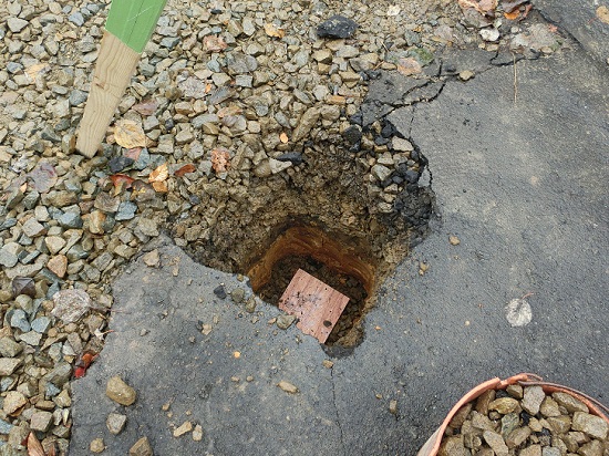 アスファルトを剥がす為、その前に散水栓周りにレンガを仮置きして、雰囲気を見てみましたが、エクセルで作った図面より余裕を持たせないと窮屈なので、急遽苗植え付けのレイアウトを練り直すことにします。今日の作業は、続きで北庭をもっと深く掘っていきます。長い土管がニョキッと突き出ています。長い土管を短い土管に替えました。次に南側のアスファルトを剥がし、砕石をトラックに積み、北庭に下ろします。ならしますが足りないので追加で砕石を投入しました。砕石投入完了です。見通しを良くする為、塀の手前を4段壊しました。南側のアスファルトを剥がした後を掘っていきます。出てきたぞ~、厄介な以前の家の三角形の基礎部分。エアーコンプレッサーのコンクリートハンマーで壊していきます。さすが!私の電動のコンクリートハンマーとは勢いが違います。今日はここで終了。