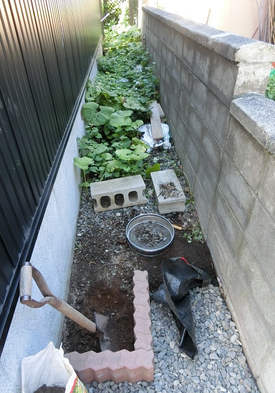カーポートの奥の物置やポリバケツを置くスペースです。お分かりですか? 家と平行じゃないんです。2mで5cmの差があります。直角じゃ無い塀の出っ張りから延長して縁石を置いた為なんです。一言、どっちに合わせますかと聞いてくれたら良かったのに・・・奥の見えない所だし、物置を置けばわかないから、まっ、いいっかまたコンクリートの基礎部分が出てきました。 どんだけ隠れてるんだ・・・土を入れ替え、日陰の花のスペースを作ろうと思っていたけど断念しました。右側から邪魔な出っ張りをコンクリートハンマーで削っては土を被せていきます。この作業で1時間もかかりました。重たいし、音が大きいし、疲れた~。オヤジと、物置を南側にあるテラスから移動して設置。あれ~?曲がって扉が開かない。台にした縁石はちゃんと水平をとったのに、物置自体がゆがんでいたんです。木を噛ませて扉が開くようにしました。水平を取ってた時間を返せ~腐葉土を作っているポリバケツを陰に置きます。ガーデンジュエリーを敷き詰めるのは来年にします。