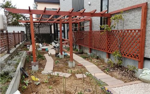 パーゴラを組み立て、ラティスを取り付け完成しました。窓がある所には横に板を取り付けられませんでした。車庫で焼き肉をする時があるので、煙を出すために開けれないとダメとの意見が約2名設計図通りにしても、素人施工なので寸法が合わずに、適当にごまかしています。秋の雪が降る前に、はすかいを取り付ける予定です。誘引棒も雪の圧力で折れたり曲がってしまい足りないのですが、後で買い足し取り付けます。 ・・・正確には9割がた完成ですラティスにクレマティスのフェアリーブルーを誘因しました。隣家の境に取り付けたラティスに、クレマティスのDRラッペル・ミサヨ・プレジデントを、奥のパーゴラに、HFヤング・白馬を誘因しました。新枝咲きのセザンヌ・ニオベ・コンテッサ・プリンセスダイアナはまだ芽が出たばかりです。