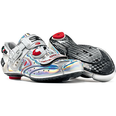 昨日の落車では見た目には全くバーテープ以外は外傷がない状態でしたので、大丈夫だと思いましたが、いつものサガミサイクルに持って行き、診断してもらいました。診断結果は・・・・バーテープ以外は異常なし・・・バーテープ交換も工賃込みで1500円位とのことだったので、交換してもらいました。純正は黒でしたが、今回は白にしました。完成後は非常にカッコイイv(^-^)vそして・・・なんとなくシューズコーナーを見ると・・・SIDIの09年モデルが半額で激安でした。履いてみると少し幅が狭いのですが、伸びる感じなので、問題なかったので、つい魔が差して買ってしまいました。あとはクリートだな・・・話題のスピードプレイにしようかな~