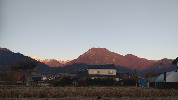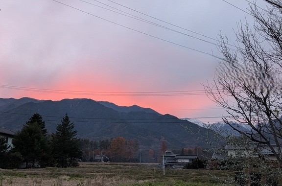 今日の空雲が面白くきれいでうっすら夕焼けの向こうに甲斐駒ヶ岳や北岳が見える