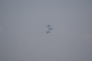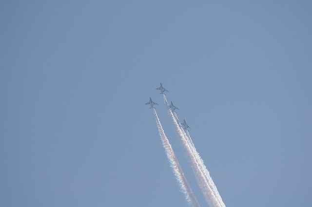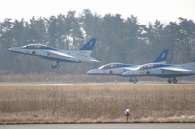 松島基地/ブルーインパルス3機が、離陸して行くところです。ほのかな、ジェットエンジンの排気臭を嗅ぎながらシャッターを切りました。ブルー機からの排出熱でピントを合わせるのも大変で、全身にジェットエンジンの排気を浴びなら撮った写真です。順位アップにご協力願います。ここを押して下さい。 ←ここも押して下さい<今朝の吾妻小富士 はれ>↑画像をクリックして下さい。<ランキングUP> ←ここも押して下さい