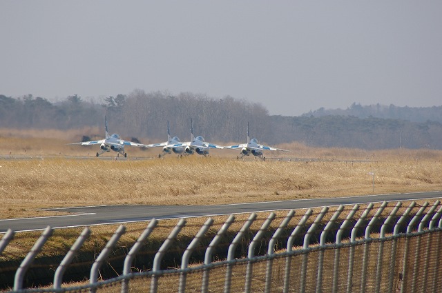 松島基地/先日からの続き画像で、ブルーインパルスの1・3・4番機の離陸風景です。しばらく、「ダイヤモンド・テイクオフ・アンド・ダーティー・ターン」を観ていませんが、これからの飛行訓練時にはやってくれるでしょう。順位アップにご協力願います。ここを押して下さい。<撮:07.02.28><今朝の吾妻小富士 くもり>↑画像をクリックして下さい。<ランキングUP> ←ここも押して下さいDVD「スーパーローリング・イン・ザ・スカイ」ブルーインパルス!!