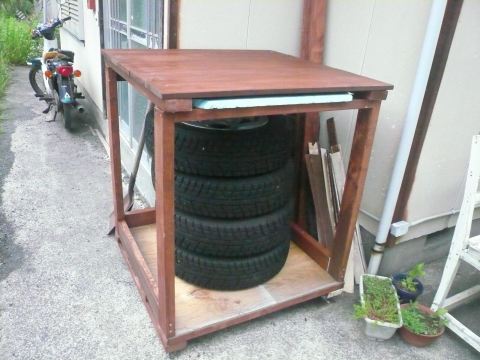 お休み。 いよいよ、お休みは今日まで。完全燃焼! って事で、以前から気になっていた、スタッドレスの箱作り。 まあ、2×4材で箱を作るだけです。キャスターがあったら便利か?って取り付けてみましたが、思いのでもっと大きなキャスターが良いようです。失敗したー。 で、扉も壁も付ける予定なのですが、時間がなくて今日はここまで。ま、またの機会に続きを。