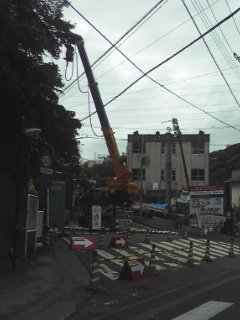 準夜勤でした。 そうそう、先日の大雨で崖崩れ?土砂崩れ?がありましたね。その経過を見て来ましたが、復旧作業中でした。 道路は出てたけど、流れている大元が工事中でした。はー、そんなコトあるんだね。ビックリ。