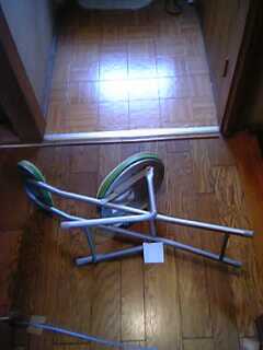 最初何が起こったか、わからんかった。突然、崩れ落ちた。ホント、ぴっくり。今日朝起きてから、ネットやってたら突然…椅子が、曲がった写真で、わかるかな?なので、もう1枚。今、地べたに座りながら書いてます。なんか、この格好新鮮です。