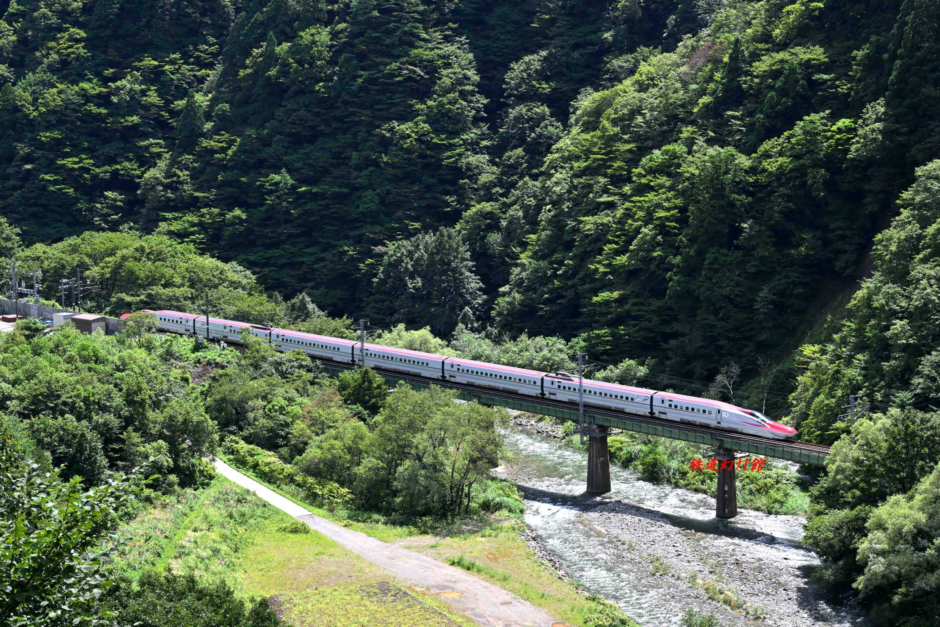 秋田新幹線の撮影では、かねてより一度訪ねてみたいと思っていた県境近くの俯瞰ポイントを今回初めて訪れることができました。鉄橋を渡るところをかなり離れた国道から撮影するアングルです。