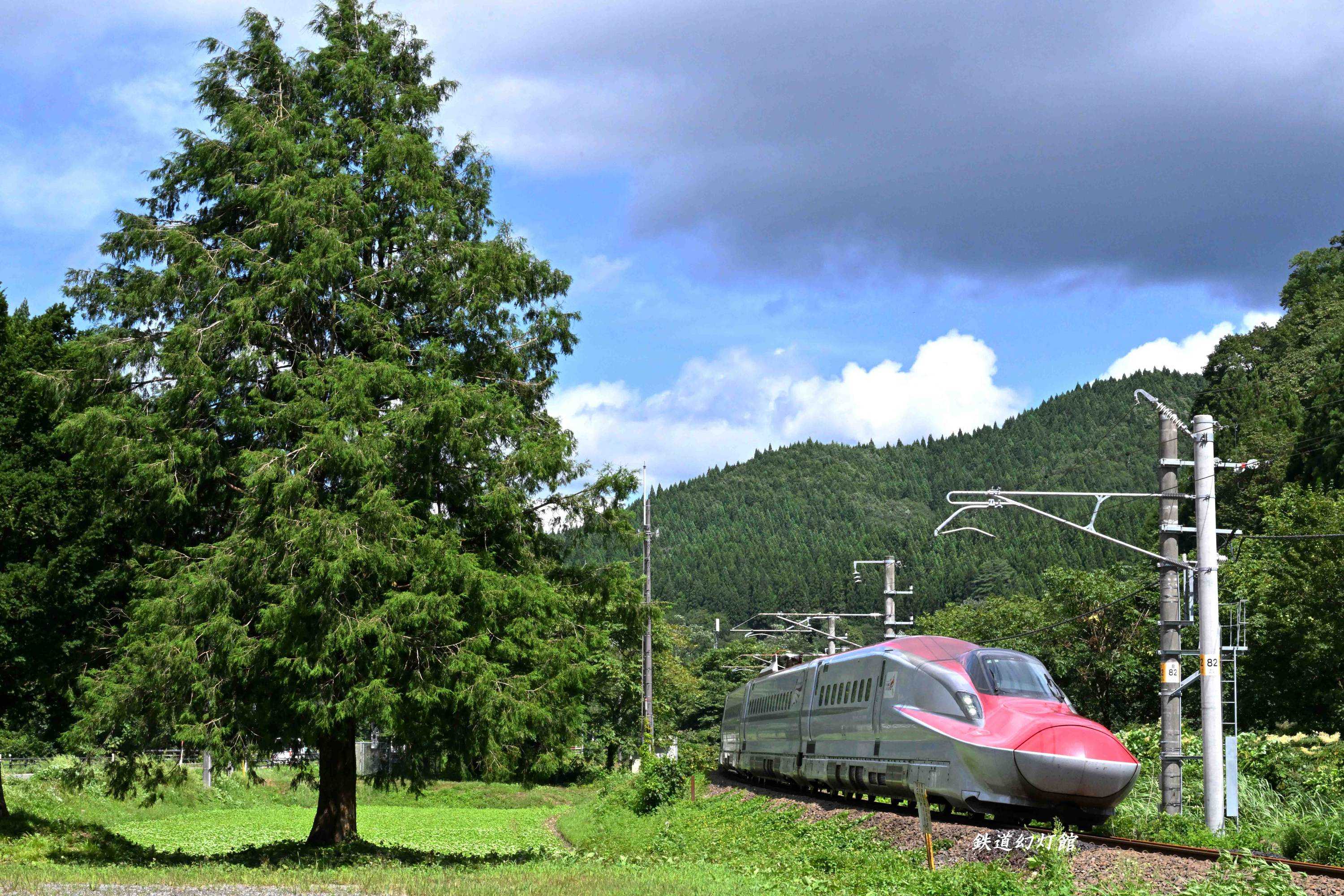 この木が杉なのか檜なのか、はたまた別の種類の木なのか、植物に不調法なわたくしには判断がつきませんが、均整の取れた三角形のフォルムは普段、針葉樹の大木をあまり目にしない者にとって、それだけで見ごたえがあります。そのそばに新幹線車輌を配置できたら、もう十分満足できるのです。