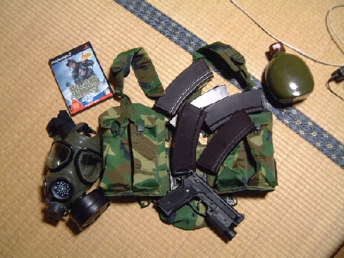 今日はじめて激震祭と言うイベントに行って来ました、今までブラックホールの雰囲気に慣れていただけに今回初参加の激震祭は一種異様な感じでした。ただ、コアなミリタリーマニア向けな感じのブラックホールと比べ激震祭の場合ミリタリー以外のブースも入っているので(少数だけど)初めてこの手のイベントに参加する人には丁度良さそうな感じでした。ちなみに上の写真は今回の戦利品です。左上:メダル・オブ・オナー“オオゴシ・トモエのカスタムバンザイ”と言うイベントに参加して貰った参加賞のゲームソフト、ちなみにこれに参加するために「銃は持ってないだろね?」と言う母ちゃんに「持ってない」と言って出て来たのはここだけの秘密だぞ。左下:M40ガスマスク防災(対テロ)用として購入、購入した本来の目的以外にもネコがウンコを漏らしちゃった時の処理、父ちゃん母ちゃんが入った直後のトイレに入らなきゃならない時など使用用途は様々。(スペアのフィルターも何個か欲しい)中央:中国軍91式アサルトベスト中田商店で1800円と言う驚異的な安値で販売されていた中国軍の正式採用ベスト、余りに安いのでどんなショボイ品なのかとワクワクしながら(ヲィ)見てみたら案外普通のベストでちょっとがっかり、でもよくガンショップで見掛ける米軍ベストの6000円位のレプリカよりも確りした作りなので初心者の人やAK使いたいけどロシア製は高くて買えないと言う人にオススメ。中央のバナナ状の物体:AK74マガジンウィリーピートのブースで纏め買いしました、電動ガンに装着して使用するにはマグキャッチの引っかかる爪を削る等2箇所ほど加工する必要があります。下の拳銃銃自体は今回購入した物ではありませんが、フラッシュライトとロングマグキャッチを購入しました、両方ともかなり良い物です。右上:中国軍の水筒アルミ製の水筒です、たたくと非常に良い音を出します。(ぽよよおおぉぉぉぉぉ~~~ん・・と言う音)