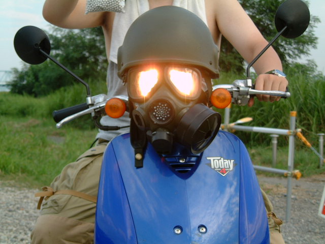 今日、久し振りにサバゲしに行ったんですが、余りの湿度の高さに参加メンバー全員が途中から動く気が失せて半分位木陰で駄弁ったりしてました、で、適当に遊んでる内にジョジョ第1部ごっこ用に持って来ていたガスマスクで何か面白い遊びは出来ないかと思い、こんな遊びをして見ました。↓※後ろに写ってるのは自分じゃないですなんつ~か・・・・ベイダー卿も真っ青の凄まじいインパクトです、ちなみにこの遊び、帰宅する1時間前位にやったんですが、外すのを忘れて家路に就いてしまい、途中の通行人の(゜Д゜)