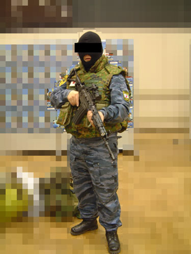ヤポニスタン内務省特殊部隊の隊員、彼はカントウ軍管区グンマ州の部隊に配属されているそうだが、細かい配属先までは教えてくれなかった。ヤポニスタンは現在、南方のリュウキュウ自治区と北方のアイヌ自治共和国において行われた地方選挙で独立派が圧勝、現在鎮圧作戦が行われており彼もアイヌ自治共和国へ派兵された事があると言う。数年前にはサイタマ州がサイタマ共和国として独立宣言を行った際にも彼は内務省国内治安軍の部隊に編入され、ウラワ議会ビルの制圧作戦にも参加したという。装備は新型のAH89自動小銃に新型市街地迷彩服に新型ボディアーマーと、かなり充実してはいるものの、警察任務に不向きな陸軍用ボディアーマーを使用せざるを得ない所にヤポニスタンの懐具合が垣間見える。このボディアーマーはヤポニスタン陸軍が2003年に正式採用したモデルで、特に海外派兵される部隊を中心に支給されている最新型だ、防弾材にはケブラーと共にセラミックプレートを使用しているため、防護性能はソビエト軍時代の6B3Tを大きく上回ると言われている。ただし、重量は10kを優に超えるため警察任務には不適切な装備であり、彼もこの装備に関しては「もっと軽いアーマーを使いたいけど、コレしかないから使ってる、アメリカの警官が羨ましい」とぼやいていた。手にしているAH89自動小銃、連邦崩壊直前の1989年に採用されたヤポニスタン軍の正式アサルトライフル、折り畳みストックを装備した空挺軍、特殊部隊向けのモデル。従来のカラシニコフ系から懸け離れたM16に近いデザインをしている事から、かなり早い時期から西側との接触を図っていたものと思われる。AH89はヤポニスタンのソビエトからの脱却の象徴とも言えるが、全ての部品を国産調達する事にしたため、今までソ連製部品の組み立てしかした事のない工員の再教育や、新たな生産ラインの構築などにより調達コストが高騰、1丁のコストがAK74の数十倍と言われているため思う様に配備が進まず、採用から20年となる現在もヤポニスタン軍の主力小銃の座には依然としてAK74が居座り続けている。また、AH89は3点バーストやショートストロークピストンを採用するなど意欲的な製品ではあるが、銃器設計の経験不足からAK74と比べ特に作動面で信頼性に問題があり、特殊部隊員などはわざわざ旧式のAK74を愛用していると言う。※分かる人には分かる事だけど、ネタなので真に受けないようにネ